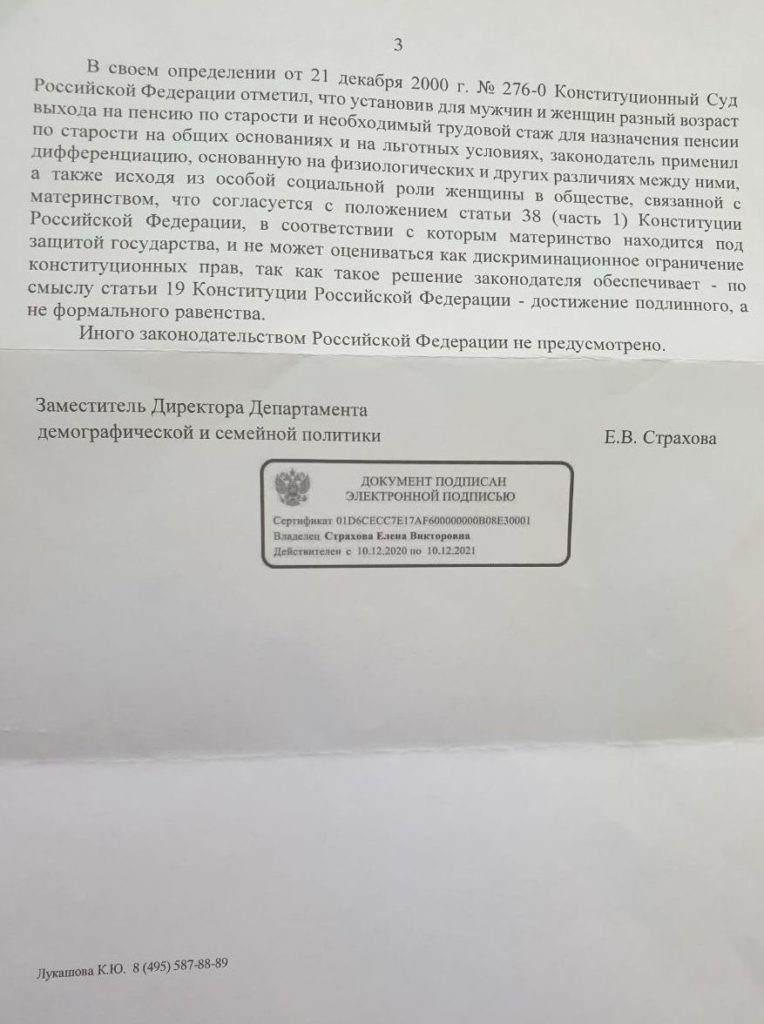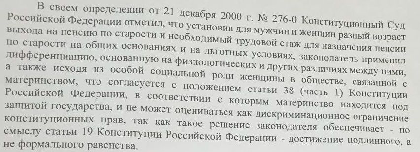 В своем определении от 21 декабря 2020 года № 276-0 Конституционный Суд Российской Федерации отметил, что установив для мужчин и женщин разный возраст выхода на пенсию по старости и необходимый трудовой стаж для назначении пенсии на общих основаниях и на льготных условиях, законодатель применил дифференциацию, основанную на физиологических и других различиях между ними, а так же исходя из особой роли женщины в обществе, связанной с материнством, что согласуется с положением статьи 38 (часть 1) Конституции Российской Федерации, в соответствии с которым материнство находится под защитой государства, и не может оцениваться как дискриминационное ограничение конституционных прав, так как такое решение законодателя обеспечивает — по смыслу статьи 19 Конституции Российской Федерации — достижение подлинного, а не формального равенства.