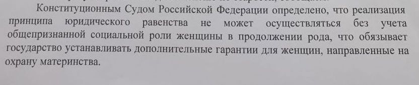 Так в нем говориться что права равны, да и Отцы могут уйти в отпуск по уходу за ребенком, и больничные брать и даже Отцовство под защитой государства, но есть одно но……… — что реализация принципа юридического права не может осуществляться без учета общепризнанной социальной роли женщины в продолжении рода, что обязывает государство устанавливать дополнительные гарантии для женщин, направленные на охрану материнства.